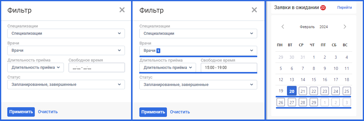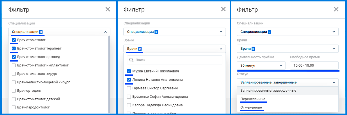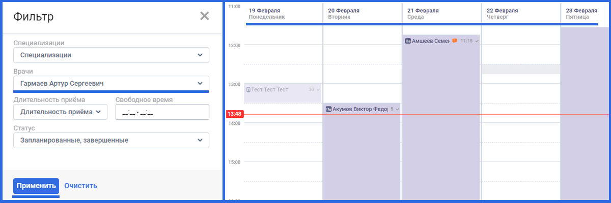 В фильтре можно отсортировать врачей по специализации, ФИО или свободному времени.