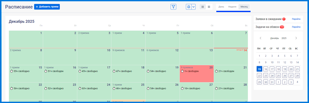 Если нажать на месяц, то также все дни закрашиваются зеленым, жёлтым или красным цветом в зависимости от загрузки у врача(ей).
