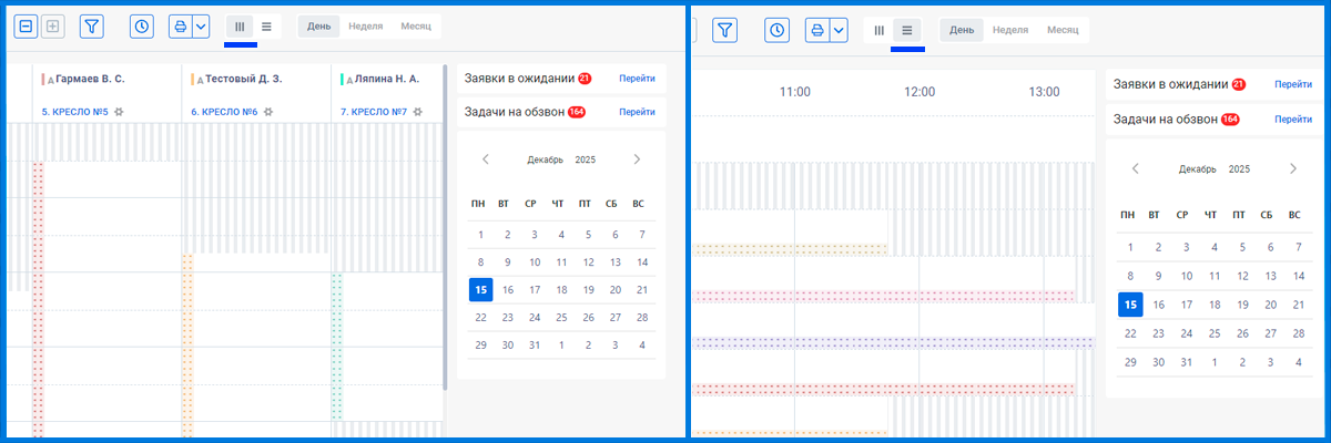Также в фильтре можно изменить статус записей на отменённые или перенесенные (плитки с перенесёнными приёмами показываются в том дне, на который приём был перенесён) для их отображения в расписании.