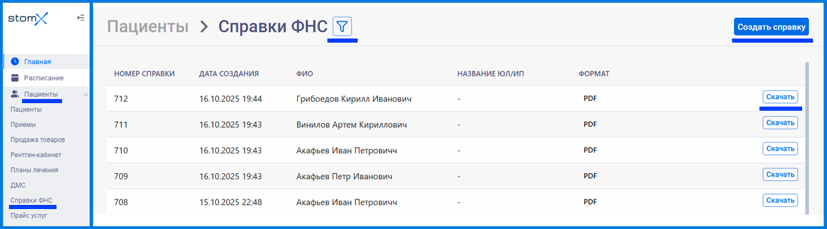 Скачать ранее сформированные справки или удалить ошибочно созданную (удаление только под ролью Директор) можно в разделе Пациенты > Справки для ФНС.