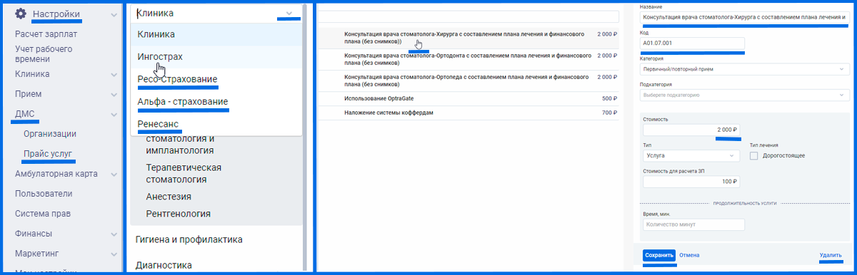 2. Под директором идем в Настройки -> ДМС -> Прайс услуг. Нас перекидывает в прайс услуг клиники, где в левом верхнем углу есть переключение Клиника или Страховая организация. Выбираем нужную страховую организацию и редактируем стоимость услуг/категории.