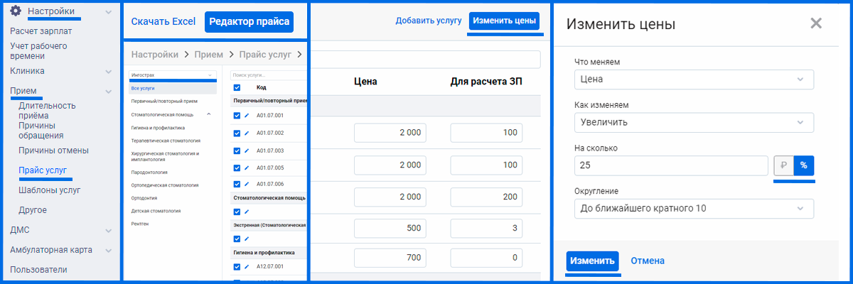 Для того чтобы массово изменить цены в прайсе услуг страховой организации в правом верхнем углу нажимаем кнопку "Редактор прайса", выбираем прайс страховой, далее помечаем нужные услуги и нажимаем "Изменить цены". В открывшемся окне указываем нужные параметры для изменения цен и нажимаем "Изменить".
