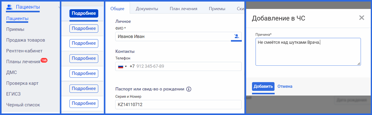 Для того чтобы добавить пациента в черный список перейдите в раздел Пациенты > Пациенты. Найдите пациента, которого хотите внести в "черный список" и нажмите "Подробнее". Далее напротив ФИО нажмите на значок человечка и укажите причину внесения в "черный список".