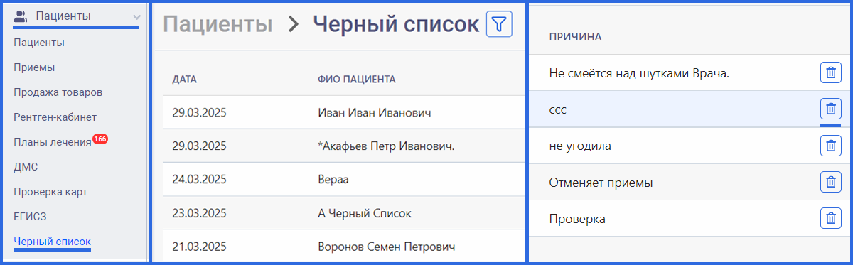 Данный пациент будет "перечеркнут" в списке пациентов, к ФИО будет добавлено "ЧС" и при записи пациента на прием отображаться красным цветом и появляться предупреждение.
