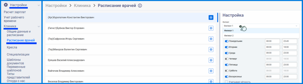 В разделе Настройки –> Клиника –> Расписание Врачей можно изменить время работы врача по каждому из филиалов (в случае если Врач может работать одновременно в двух филиалах).