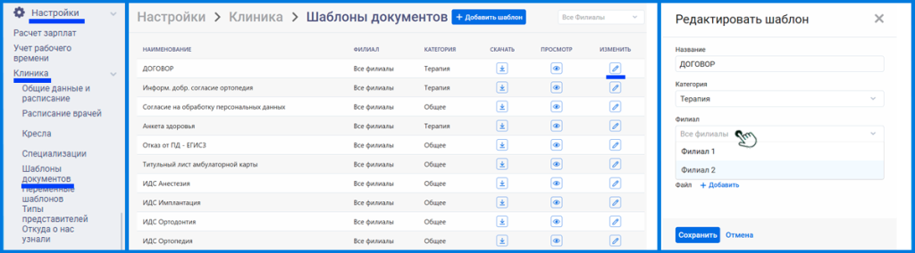 Для разделения документов по филиалам перейдите в раздел Настройки –> Клиника –> Шаблоны документов. Нажмите на иконку карандаша для внесения изменений в данный документ. Выберите филиал на нужном документе и нажмите «Сохранить».