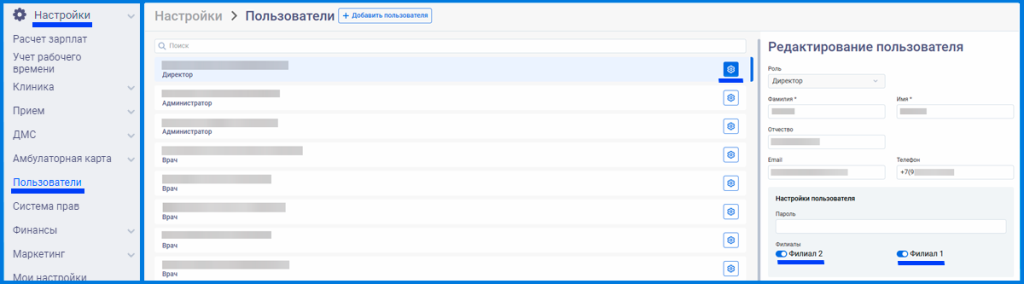 Настройки –> Пользователи –> Нажимаем на шестерёнку по выбранному сотруднику -> В разделе «Филиалы» переключаем ползунок Вправо или Влево по нужному филиалу (Серый – доступ закрыт / Синий – доступ открыт) –> После внесения изменений нажимаем «Сохранить».