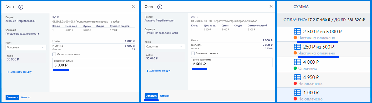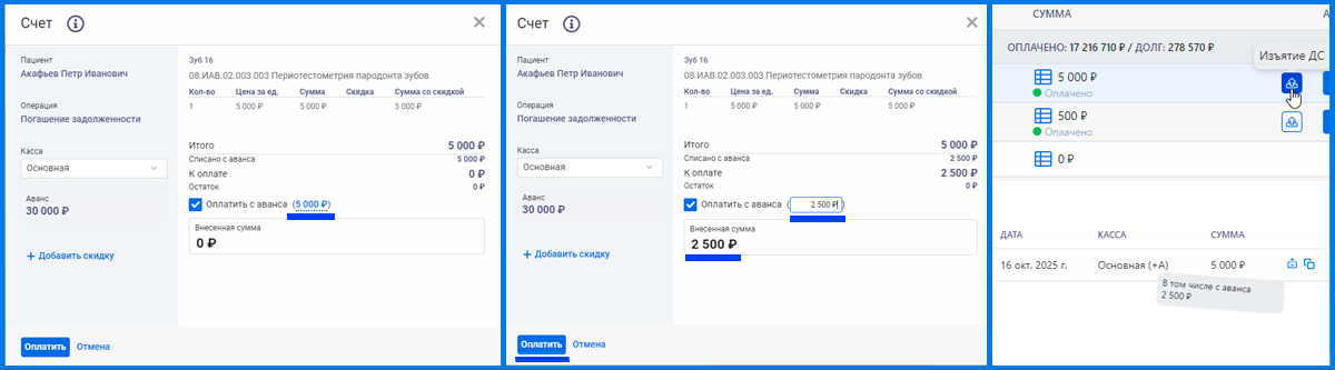 Важно! Аванс и Долг пациента не связаны между собой!