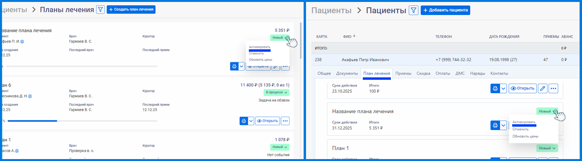 6. Для активации плана лечения нажимаем на кнопку «Новый» и в выпадающем списке выбираем «Активировать». Статус «Новый» меняется на статус «В процессе» (также статус может измениться автоматически, если сформировать счет пациенту из плана лечения на странице «Формирование счета»).