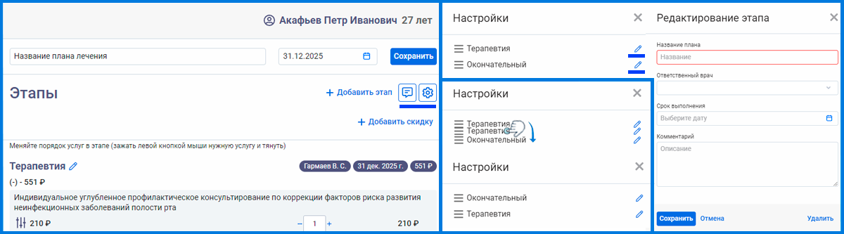 Этапы можно удалять, добавлять, менять местами, переименовывать. Также можно добавлять комментарии, выбрать ответственного за этап врача, устанавливать сроки выполнения.