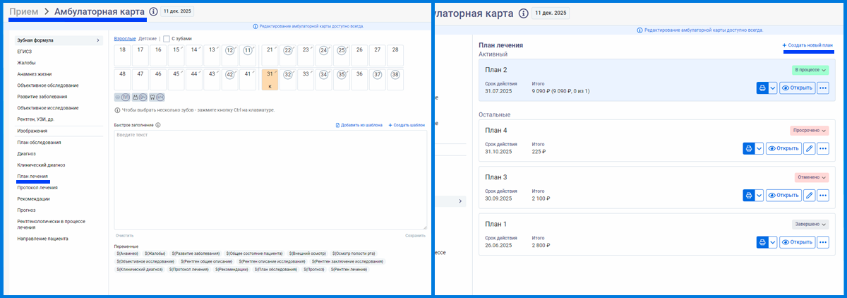 1. Открыть и распечатать план лечения можно в амбулаторной карте, разделе Пациенты -> Планы лечения и в карточке пациента в разделе список пациентов. Редактирование плана лечения доступно в разделе «Планы лечения» и в амбулаторной карте пациента.