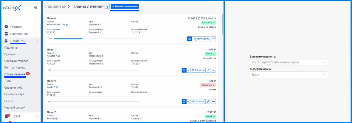 2. Можно создать план лечения и без проведения приёма, для этого заходим в раздел Пациенты - > Планы лечения, сверху нажимаем на кнопку «+ Создать план лечения», выбираем пациента и врача (если создание идёт под ролью не Врач).