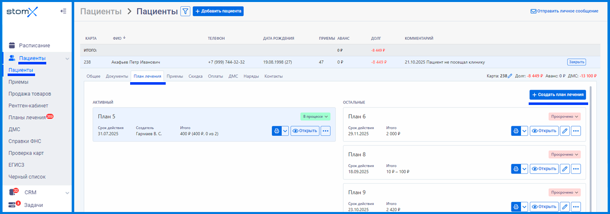 3. Перейдите в раздел Пациенты -> Пациенты, с помощью фильтра найдите необходимого пациента и перейдите в карту пациента, нажав на «Подробнее». В карте пациента откройте раздел «План лечения» далее справа нажмите «+ Создать план лечения»