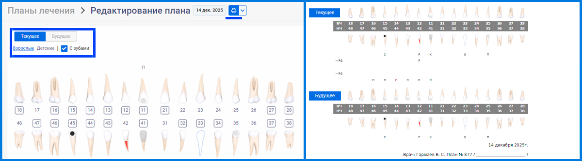 3. Для отображения графической зубной формулы установите галочку над зубной формулой «С зубами», а также при создании плана лечения появилась возможность визуально показать что будет с зубами после выполнения плана лечения, переключаясь между вкладками «Текущее» и «Будущее».
